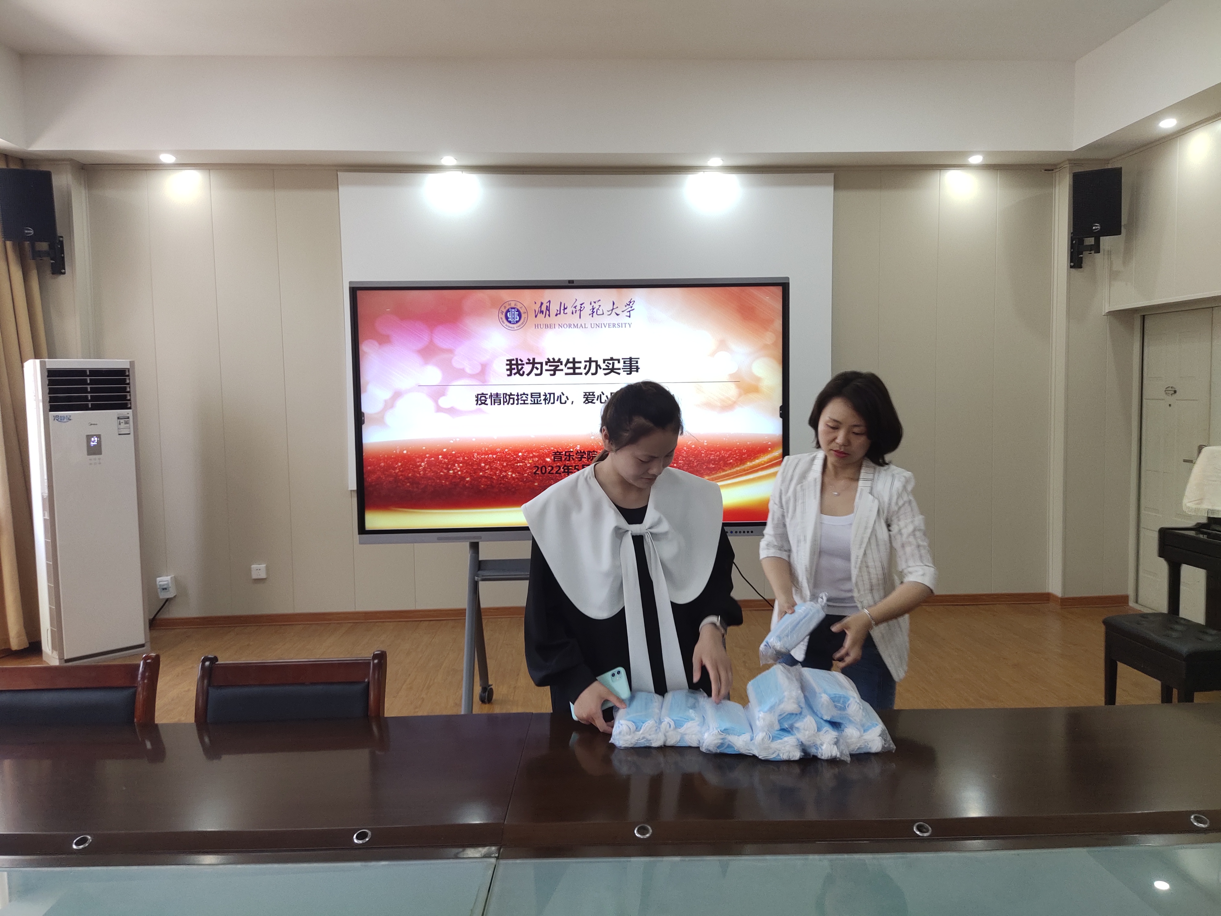 发放现场,副书记罗杨肯定了同学们对防疫工作的支持和付出,要求全体同学继续站在讲政治、顾大局的高度,严格遵守疫情防控各项规定,持续保持良好的防疫习惯,正确佩戴口罩,勤洗手、多通风、少聚集,齐心协力、同舟共济,共同筑牢校园安全防线。