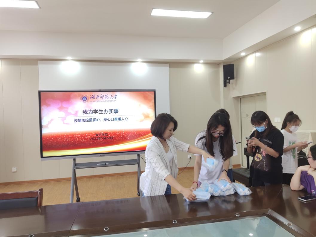 5月24日中午,党总支副书记罗杨和辅导员余景涛、杨娇、付思墁走进学生群体,在13311会议室以班级为单位,为全院在校学生发放防疫爱心口罩,覆盖205间学生宿舍,共计10000余只。以口罩连接师生情感,用爱心驱散疫情阴霾,将防疫工作做到实处。