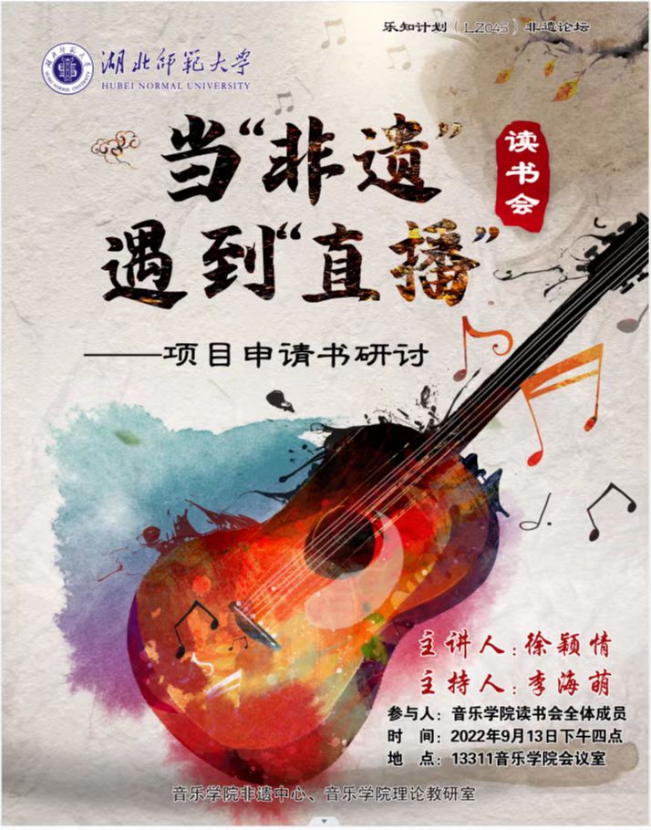 2022年9月13日下午4点00分在音乐大楼13311会议室开展了当“非遗”遇上“直播”——项目申请书研讨(乐知计划LZ045)非遗讲坛活动。此次活动由徐颖情主讲,李海萌副院长主持,徐晴岚、杨小丹、张蕾、胡丽君、张恕、程洁、黄芳、张金栋、徐海、唐天齐等老师以及部分学生参加讨论。