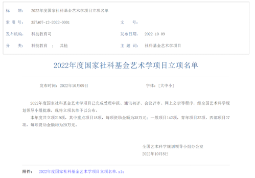据悉,国家社科基金艺术学项目是我国艺术学领域层次最高、资助力度最大、权威性最强的国家级课题。所立项的课题具有权威性、导向性及示范性,也体现了各高等院校及研究机构强大的学术研究实力。