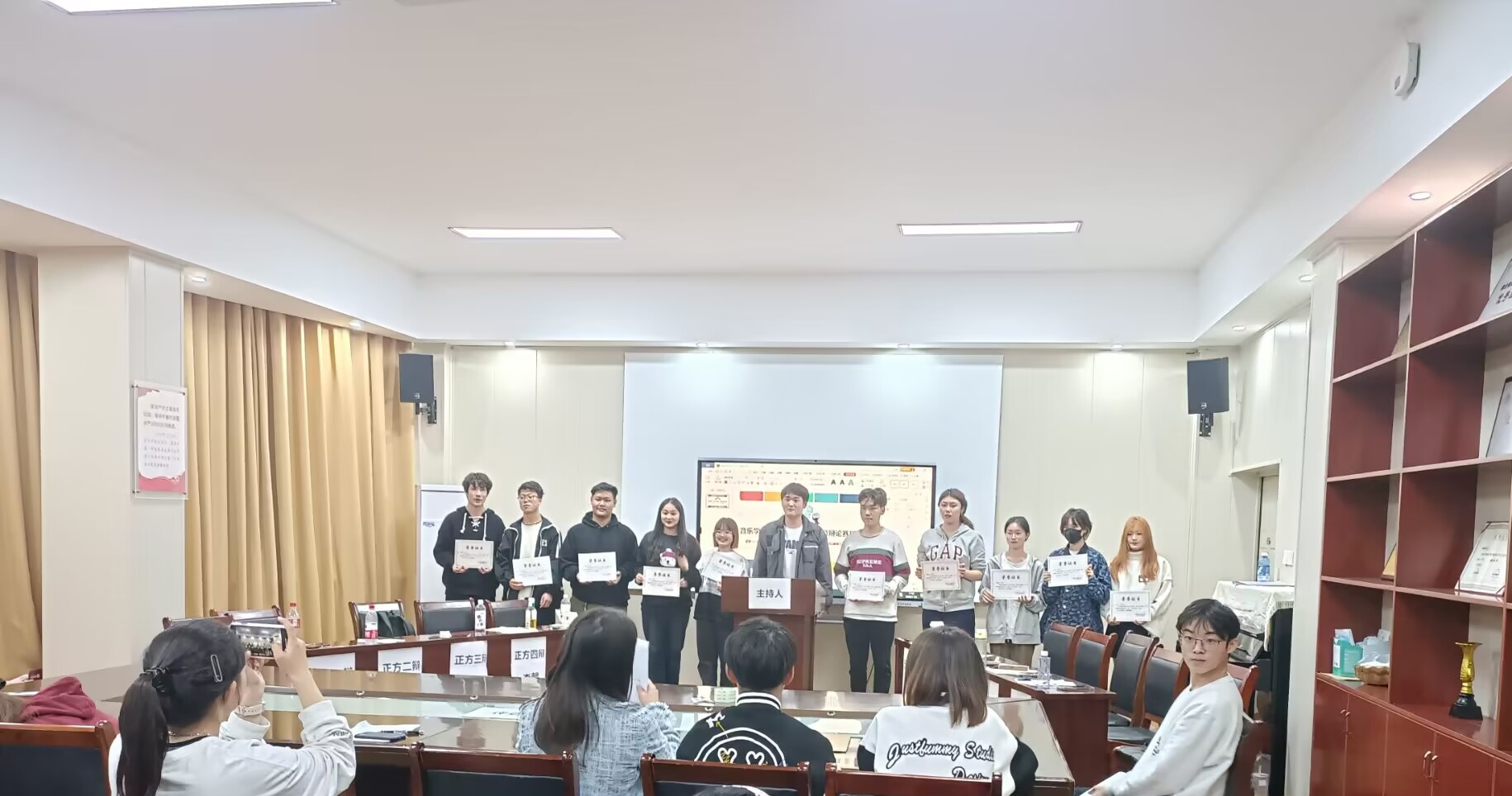 在总结陈词环节,双方辩手沉着冷静、逻辑清晰、框架明确,引得场下观众激情澎湃、掌声连连响起。最终郑瑶丹、徐楚涵、岳昕怡、姬榕霞、谢双鲜五位同学脱颖而出,将代表学院与历史文化学院进行“安全与法制”教育辩论赛决赛,预祝他们收获友谊,取得佳绩。