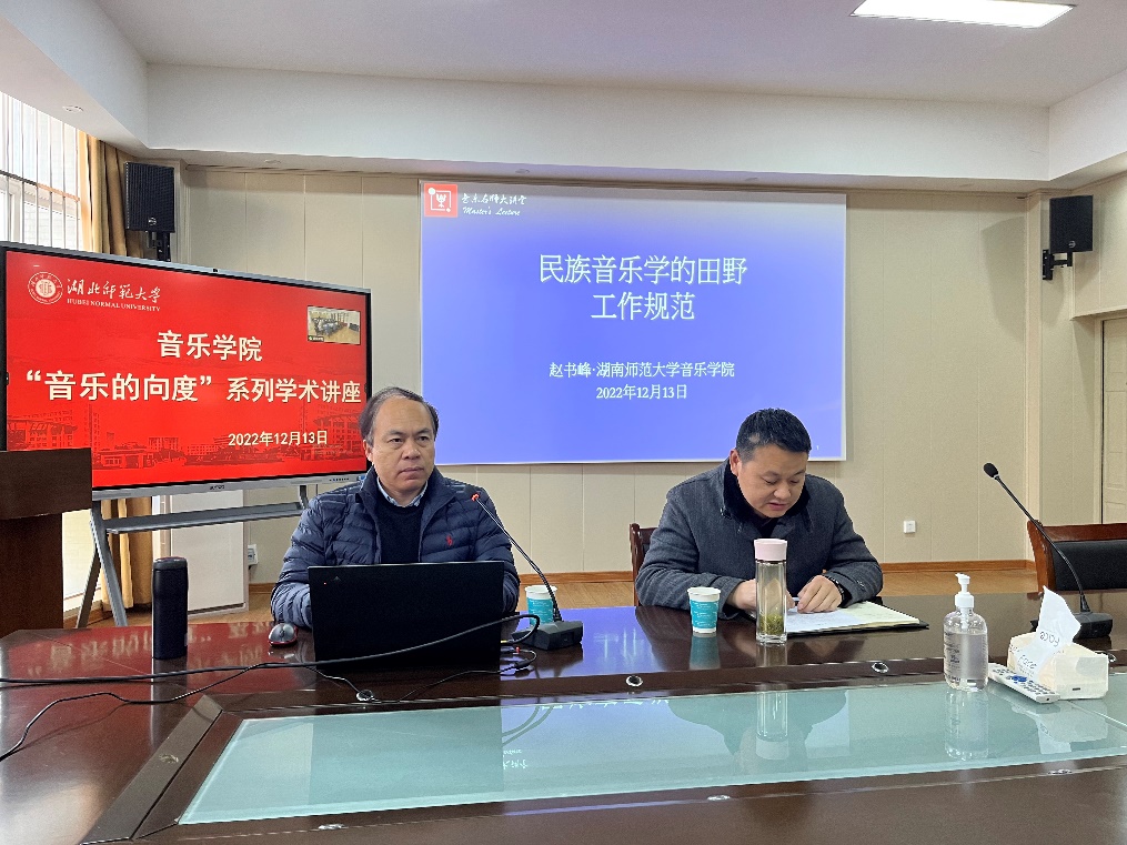 2022年12月13日上午8点,在音乐学院13311会议室,我院邀请湖南师范大学赵书峰教授开展题为《民族音乐学的田野工作规范》的学术讲座。此次讲座采取线上线下形式开展,李海萌副院长作为主持人,副高及以上职称教师、博士、全体研究生以及部分兄弟院校教师参加。