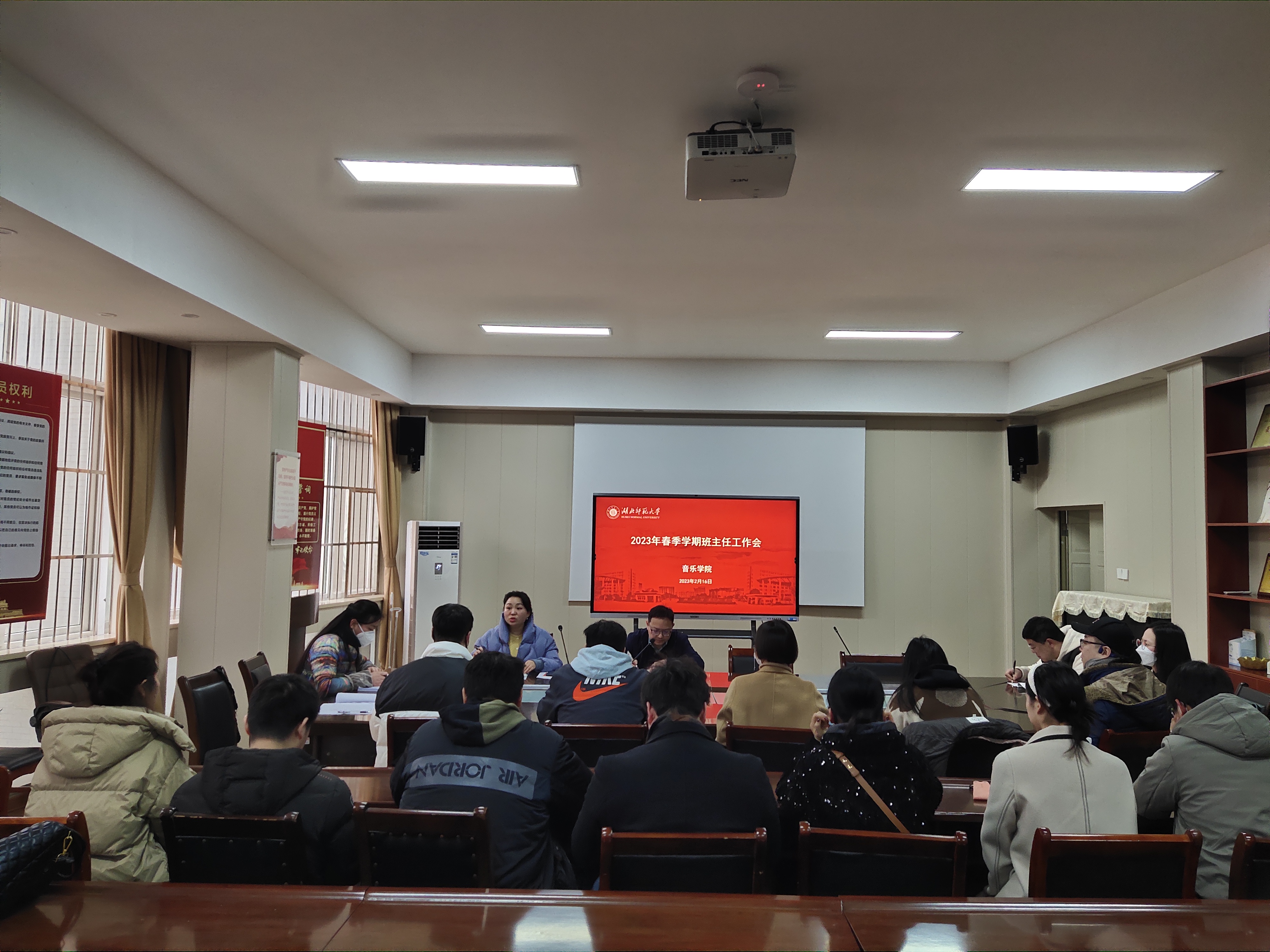 为深入贯彻落实学校2023年春季学期学生工作会相关工作部署,确保开学初各项重点工作有序开展,2月16日下午,音乐学院在13311会议室召开2023年春季学期班主任工作会。音乐学院党总支书记陈文斌、副书记罗杨、全体辅导员和班主任参加会议。