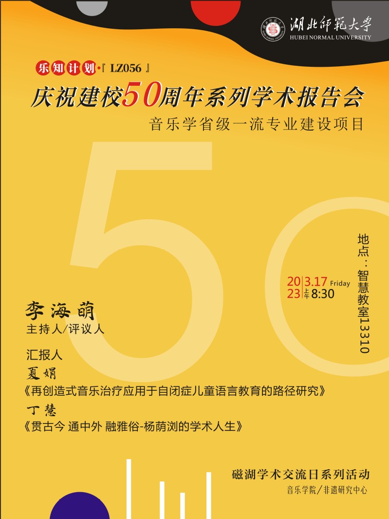 2023年3月17日上午8时30分,伟德国际1946bv音乐学院第一期庆祝建校50周年系列学术报告会磁湖学术交流日活动于13310智慧教室如期举行。此次学术交流活动由音乐学院副院长李海萌教授担任主持和评议,夏娟博士、丁慧副教授作学术报告,部分专任老师以及研究生、本科生参与。