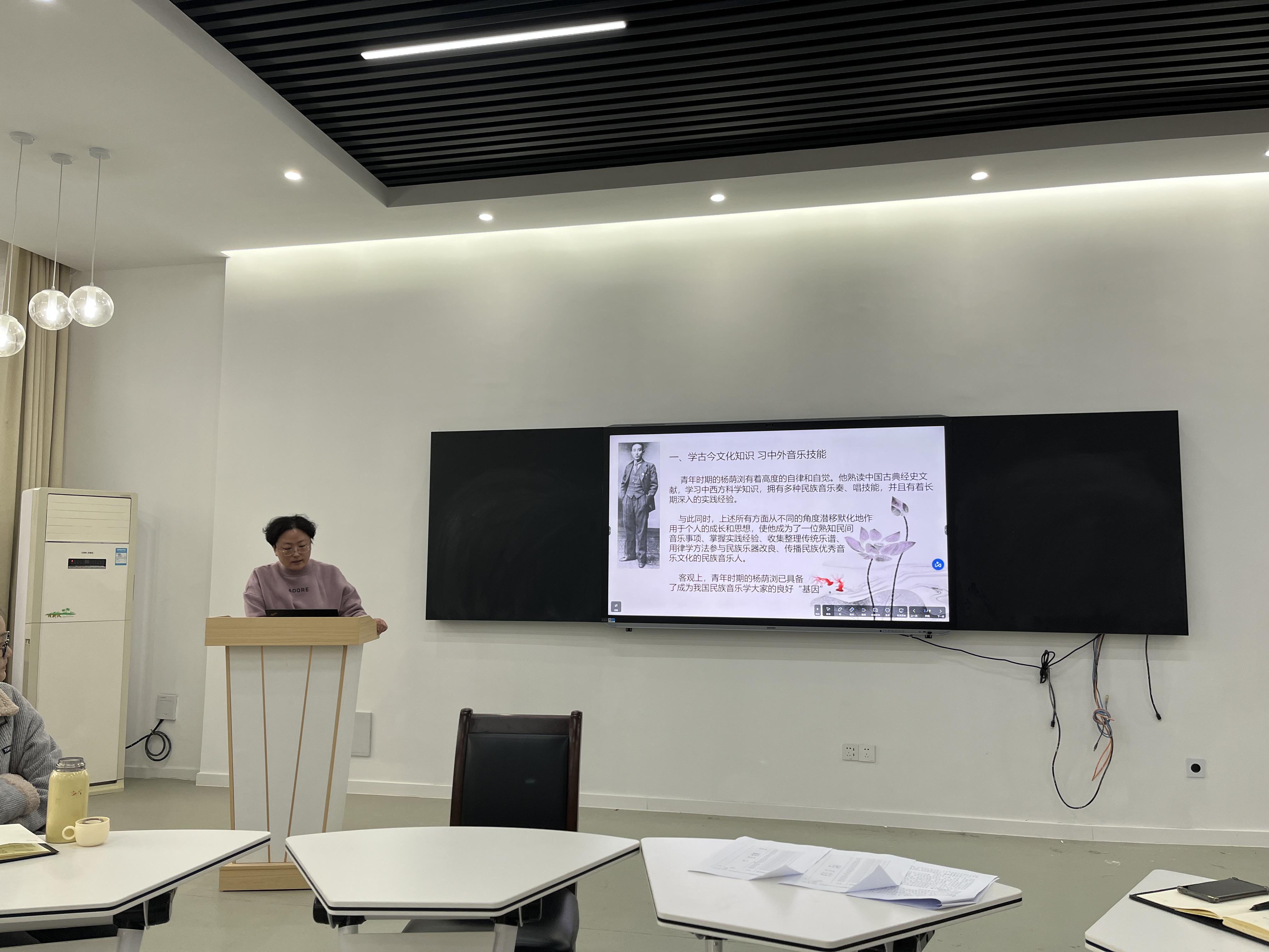 夏娟博士结合申报的科研项目进行《再创造式音乐治疗应用于自闭症儿童语言教育的路径研究》汇报,分享了自闭症儿童语言相关的研究现状、研究意义以及目前取得的科研成果。丁慧副教授《贯古今 通中外 融雅俗-杨荫浏的学术人生》的汇报,介绍了音乐大家杨荫浏一生的学术追求,以古鉴今,分享了诸多启示。李海萌副院长对两位汇报人的内容分别作了精彩的总结与评议,与会的师生积极参与了两个主题的讨论。