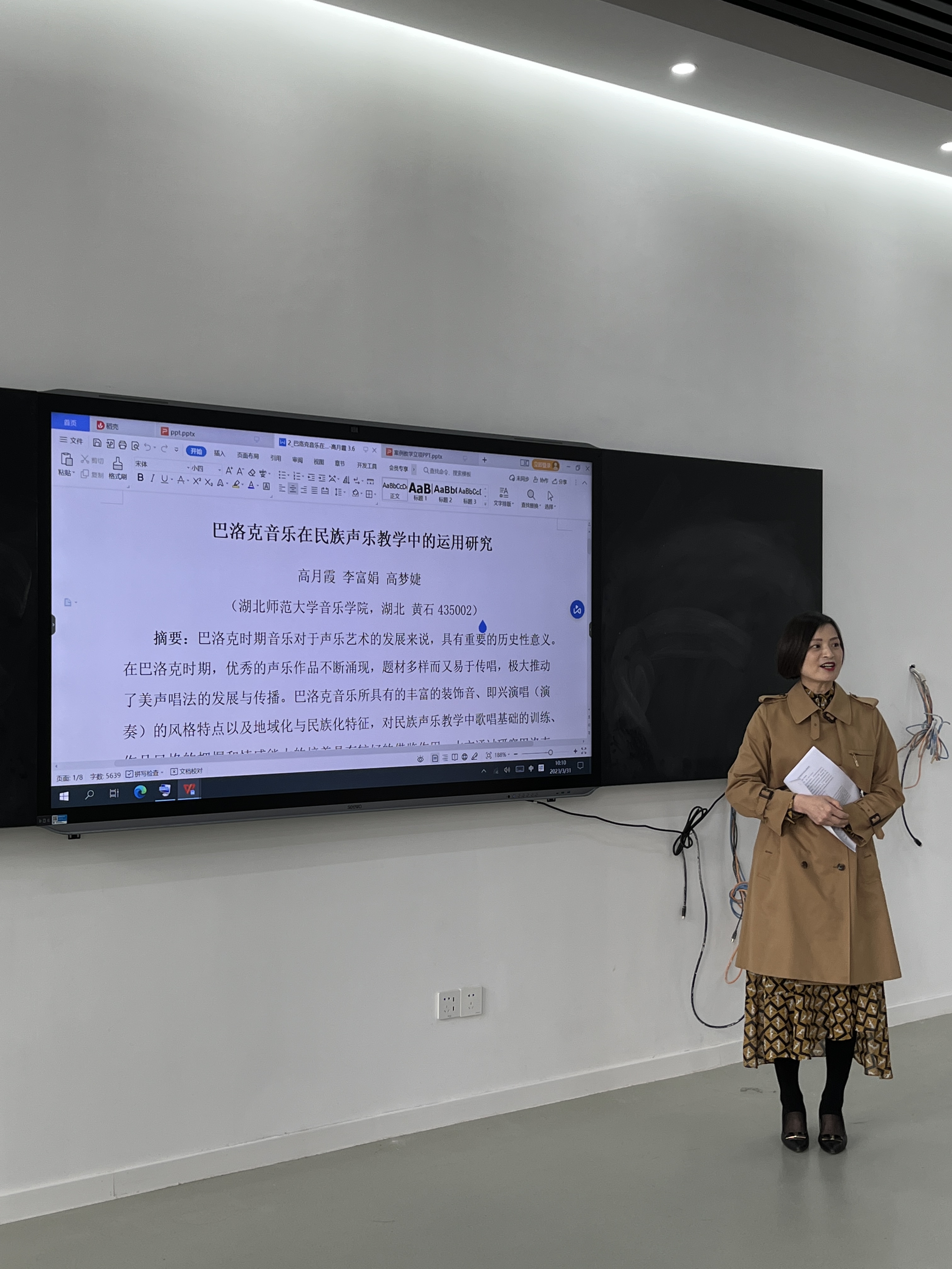 易秀华博士结合申报成功的研究生案例库建设项目作了题为《案例教学法在表演美学课程教学中的应用》的汇报,分享了案例库建设的基本信息、立项依据、建设方案、建设目标与成果。在汇报中易博士结合个人读博经历分享了做学术研究与申报课题的经验,同时她力图实践“美学要下来,艺术要上去”的表演课程教学理念,旨在增强课程的实践性,实用性,提高学生的艺术实践能力,这种理念激发了在座教师对于课堂教学的深刻思考。高月霞副教授作了题为《巴洛克音乐在民族声乐教学中的运用研究》的汇报,介绍了她个人对巴洛克音乐的情怀,巴洛克时期的音乐特点,巴洛克音乐与民族声乐艺术的融通性,最终落脚点在巴洛克音乐在民族声乐教学的运用,这正是她在平时声乐教学中注重培养实践。