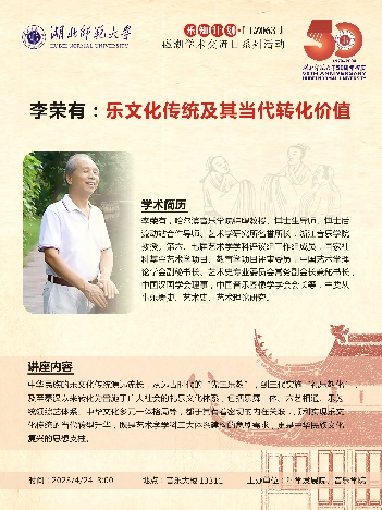 紧接着,李荣有教授从20世纪末文化自觉、文化自信及至文化复兴的背景下,高校中各学科均以创构独具中国特色的理论体系、学术体系和话语体系作为立足之本,但仍处在艰难的跋涉阶段引入今天的主题,然后从“乐”字初义、乐文化传统、当代转化价值三个方面介绍讲座主题。他认为师范学院的音乐专业学子应关注传统,关注大文化背景,找准音乐专业的定位。但是关注传统,并非是要完全回到过去,而是要在基础理论领域找回母语文化的发声点,人人必须敬畏常识,敬畏传统,方能找准定位和方向。