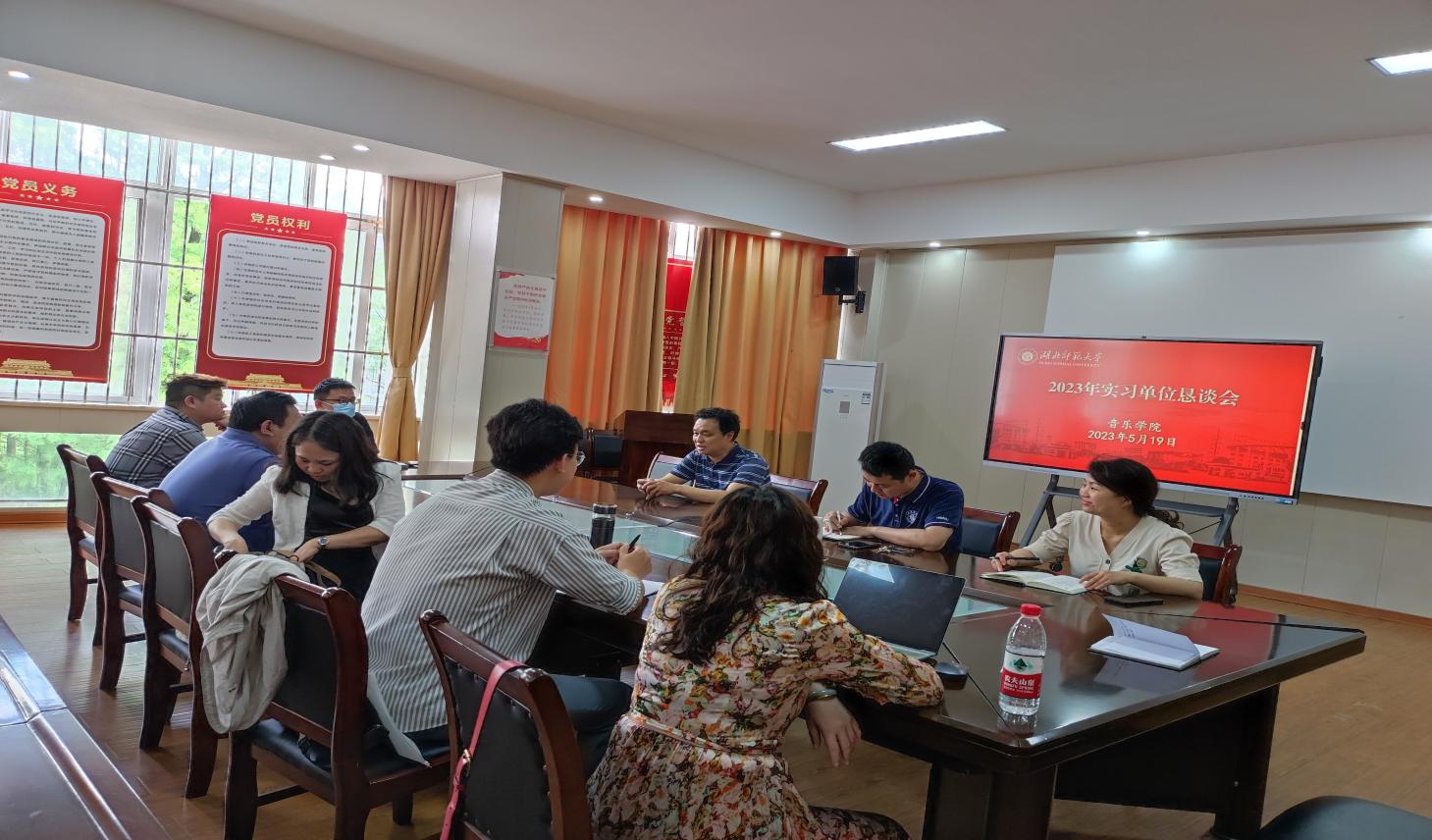 519午,音乐学院本科实习实践合作单位恳谈会在音乐学院13311会议室召开。会议邀请了深圳卓凡教育管理有限公司上海华劢文化传播有限公司宁波瀚森文化发展有限公司、鄂州市鹤鸣文化艺术学校、湖北省民族歌舞团等实习单位、用人单位的负责人音乐学院院长周友良副书记罗杨、副院长李海萌教学办包诗蕊老师出席了恳谈会,会议由院长周友良主持。