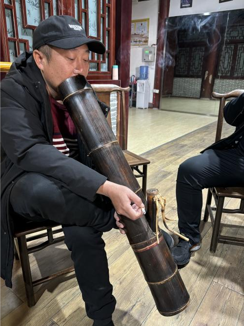 排练结束,大家围坐一圈,开始访谈,访谈从老者手捧的水烟谈起。建水小调传承人张汝林(彝族)老师拿出各种大小规格的水烟给我们展示,告诉我们水烟的种类和用法,我们也纷纷拿起试用,就这样,大家都自然的打开了话匣子。