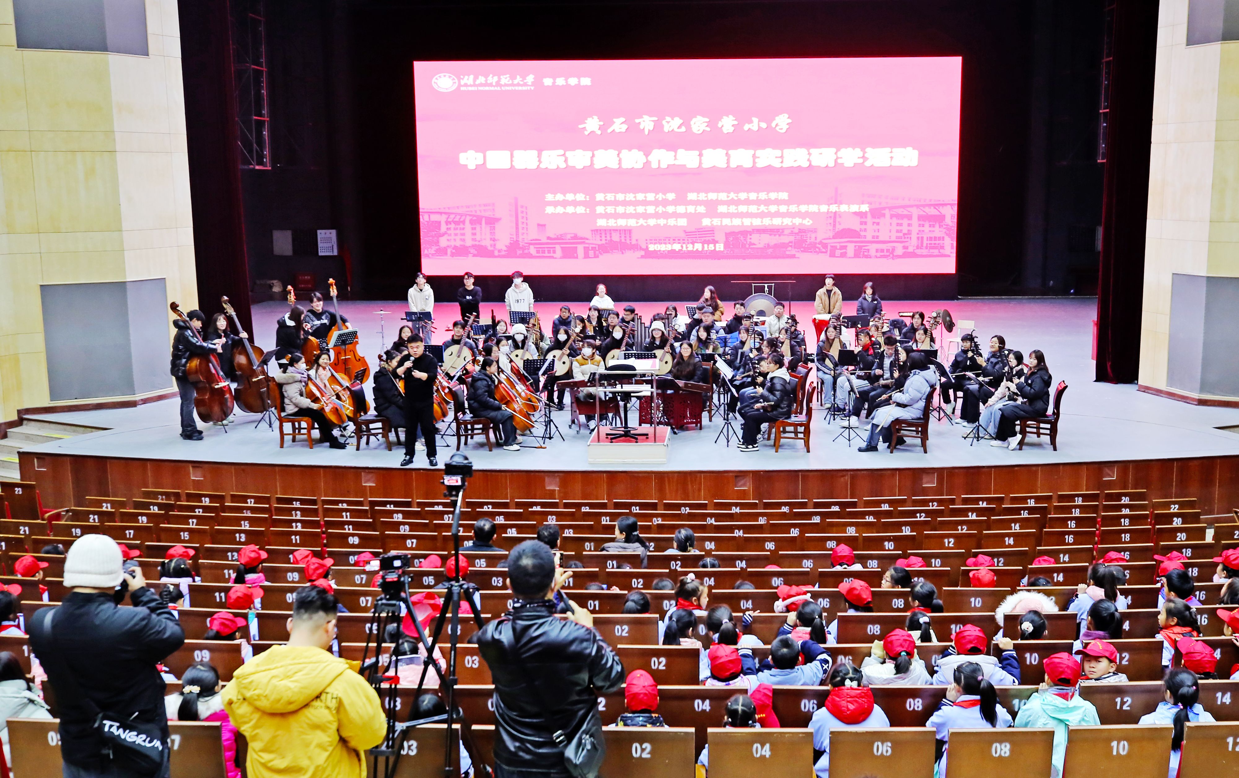 2023年12月15日清晨,寒风夹杂着雨雪,黄石市沈家营小学张莉校长率领本校师生和部分家长共计240余人,来到湖师大剧院参加“中国器乐审美协作美育实践研学活动” 。