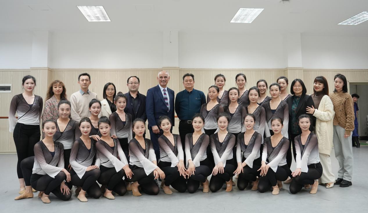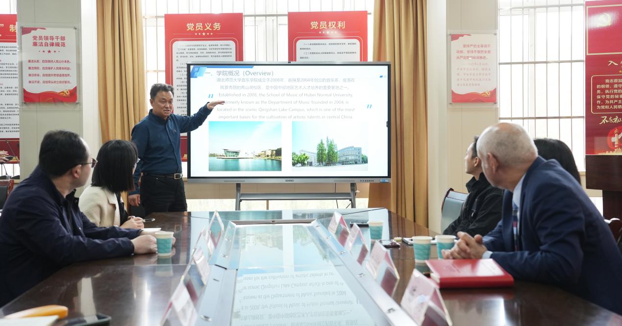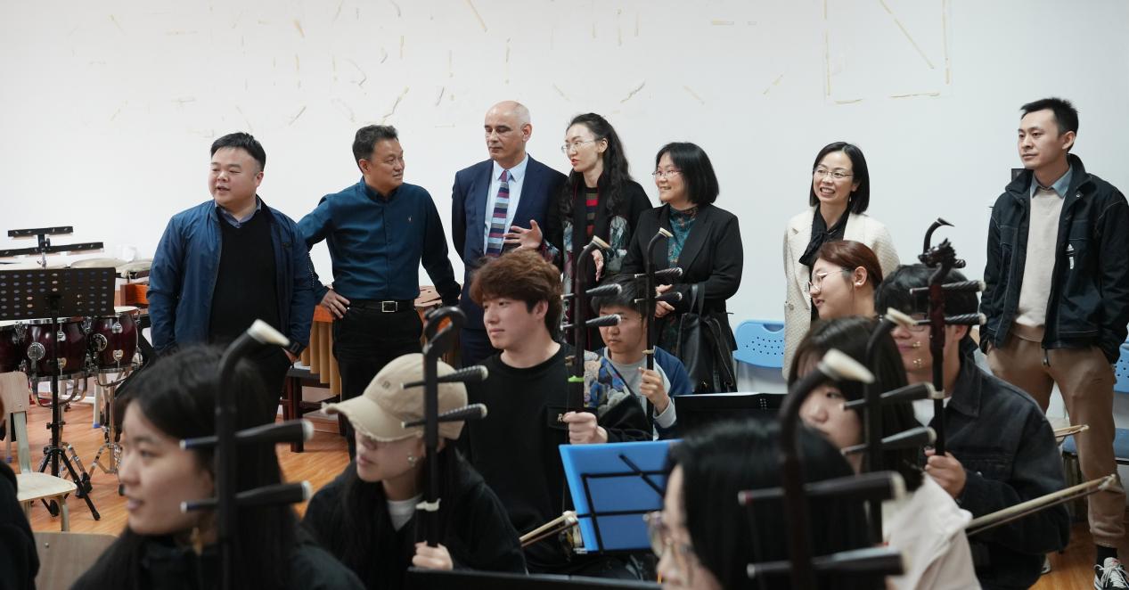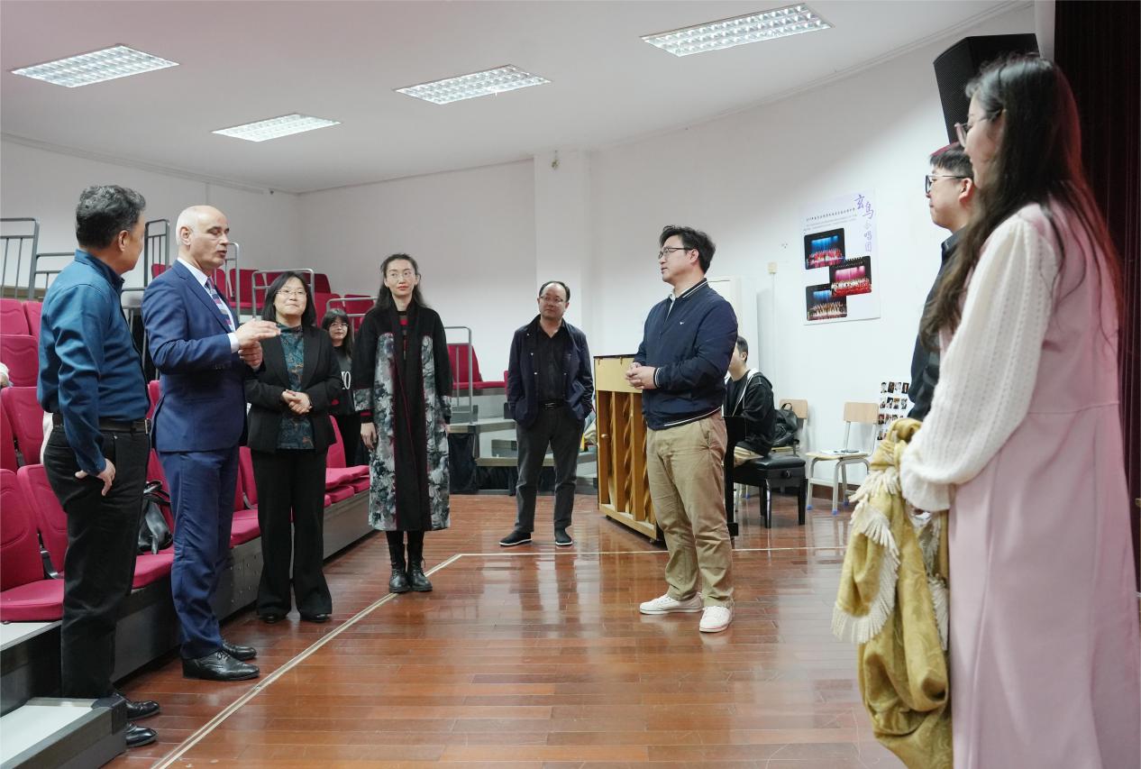 Tom Maguire 教授等一行人先对我校的水上莲花大剧院以及校史馆进行了参观,对建校和建院历史进行了初步了解。接下来对音乐学院开设的中国民族民间舞、重唱与歌剧排练、乐队排练课程相关课程进行了观摩。随后双方负责人对未来的合作发展进行了深入讨论。主要从学术交流,中外合作办学,和中外课程设置三个方面进行了探讨。