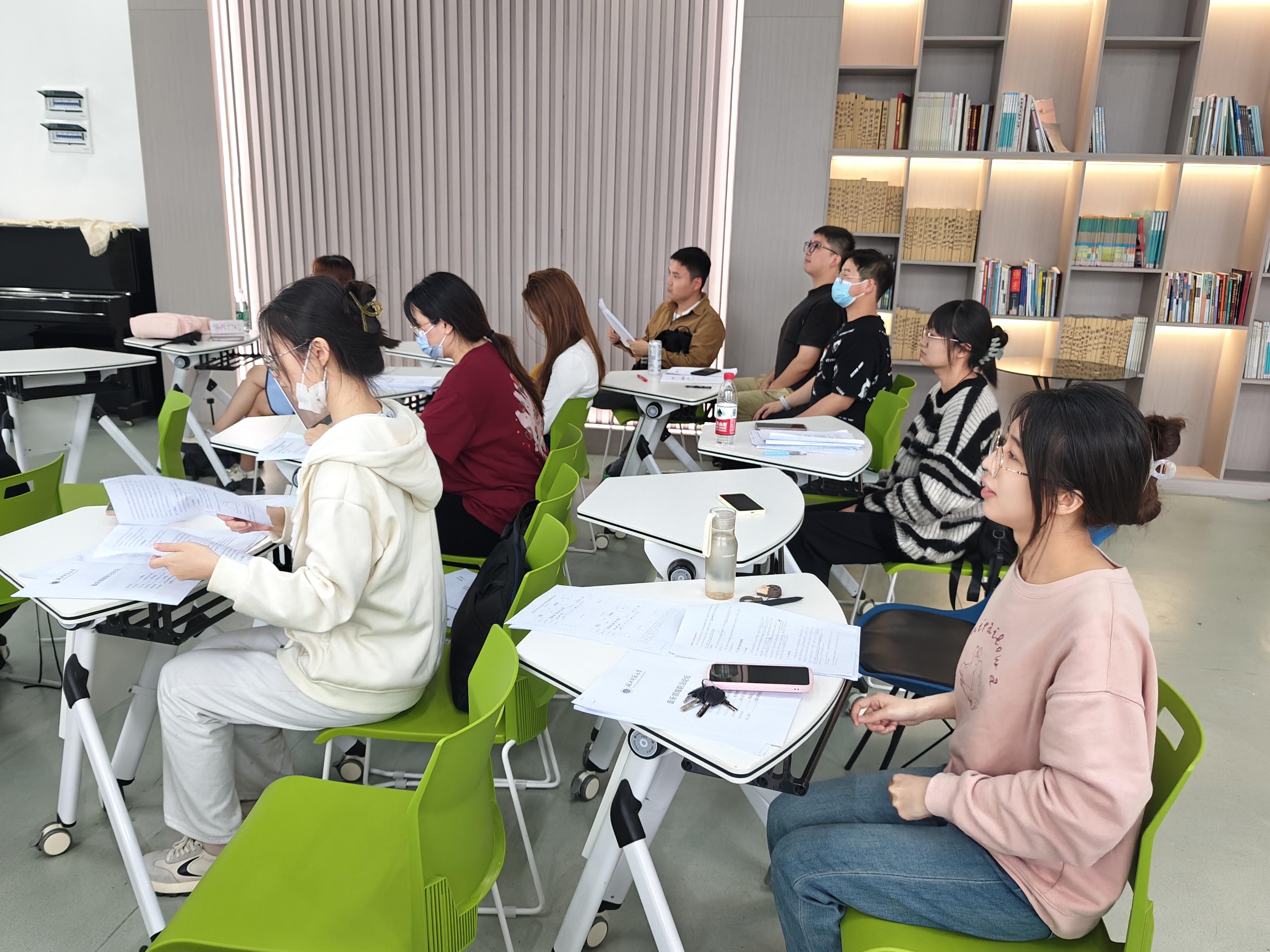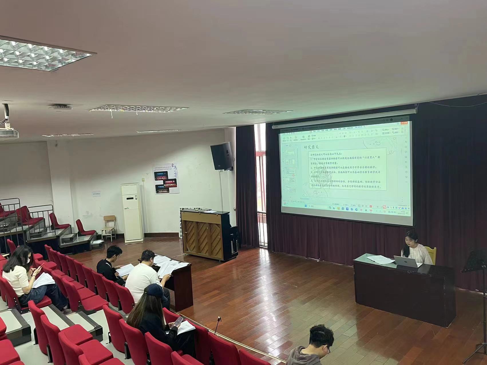 在13316教室,22级音乐表演研究生丁丽姿以《中学音乐课美育浸润路径研究》为题,从研究目的、理论依据、实际意义、研究的指导思想及主要内容等方面依次讨论“美育浸润行动”的“黄石视角”。22级音乐表演研究生闫晨晨对中国古诗词艺术歌曲《蝶恋花·槛菊愁烟兰泣露》的演唱处理进行分析讲解。段高升等导师针对两位同学的汇报进行了启发式的提问与针对性指导。此后,22、23级音乐表演与音乐教育研究生先后进行了汇报。
