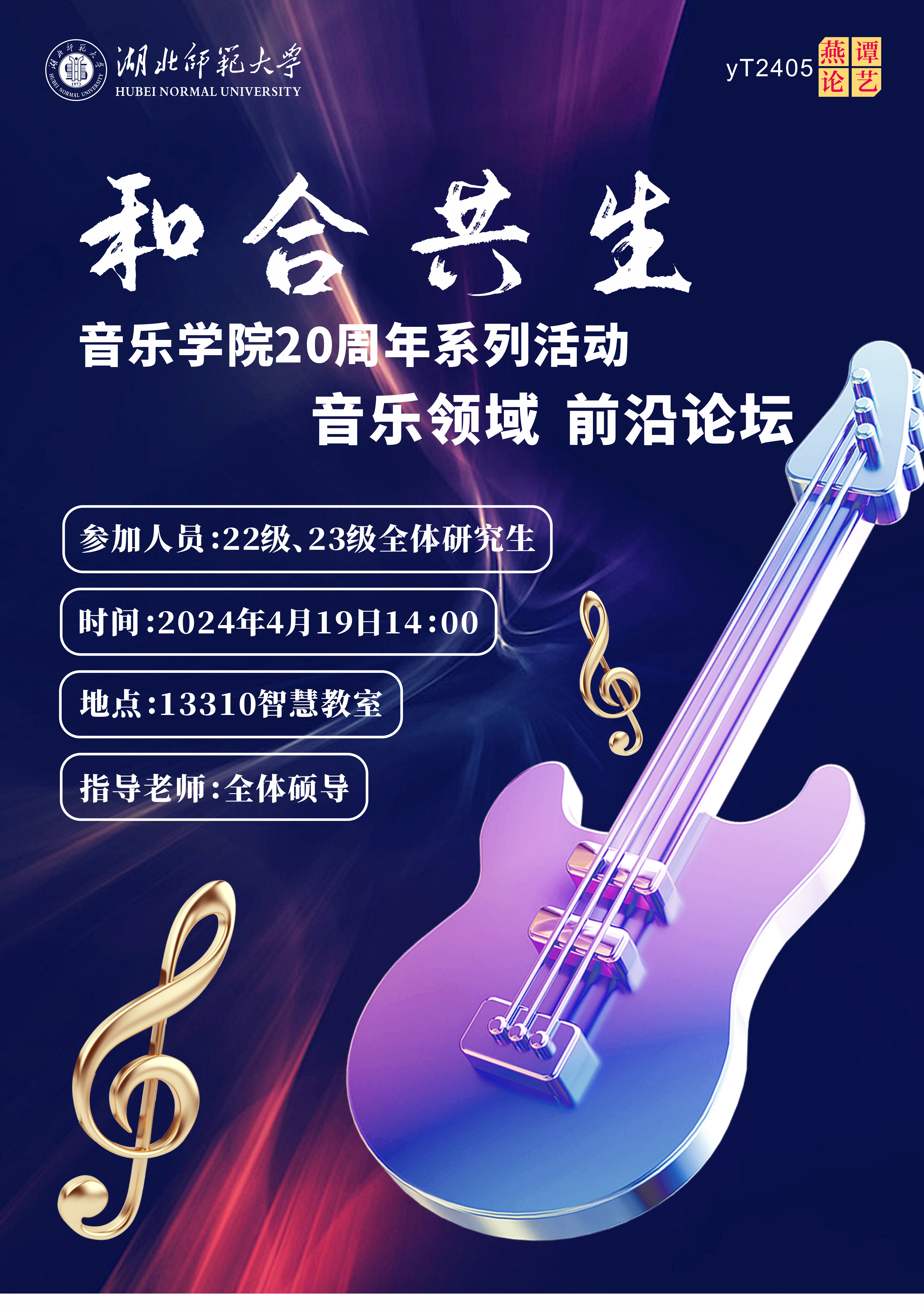 4月19日下午,音乐学院2024年春季音乐领域前沿论坛(编号:yT2305)在音乐学院13310与13316教室如期举行,本期论坛由2022、2023级全体研究生依次主讲,徐晴岚、蒲实等六位导师进行评议。