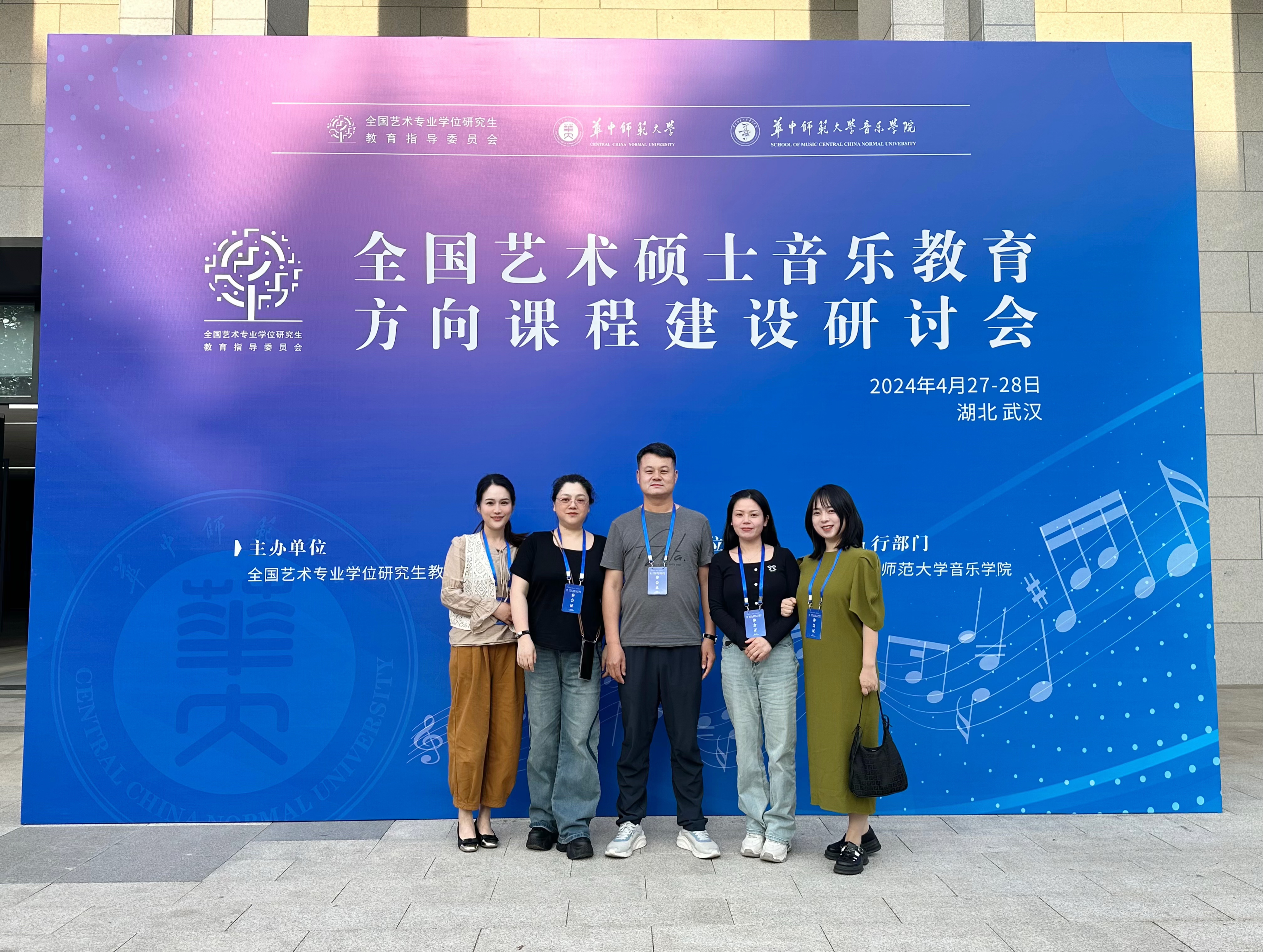 2024年4月27日,伟德国际1946bv音乐学院李海萌副院长和徐晴岚、易秀华、韩林彤、夏娟四位老师一行五人应邀前往华中师范大学参加“全国艺术硕士音乐教育方向课程建设研讨会”。