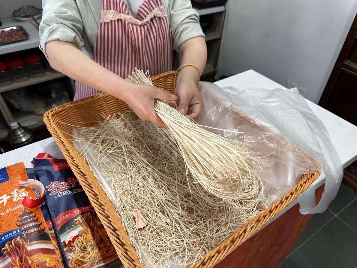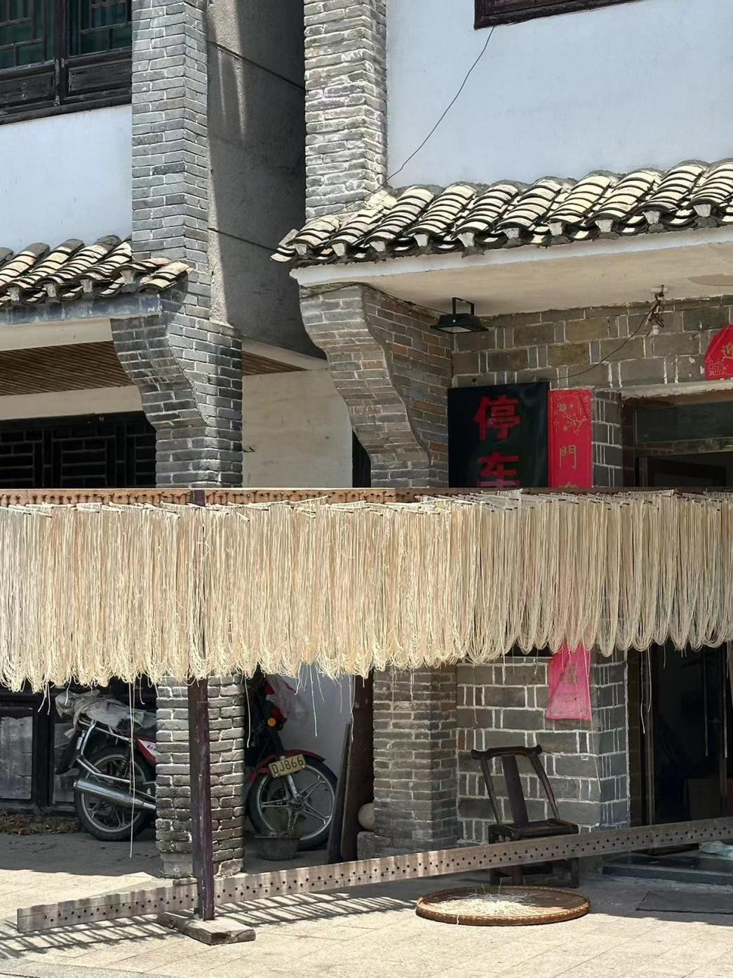 接着,我们了解到了罗田的非遗特色油面。传说元朝罗田多云乡(今九资河镇)农民徐寿辉率百万起义大军,纵模中原,所向无敌。但随着义军占领的区域扩大,免不了长途征战。路途太远,粮草携带就成了关键问题。徐公与夫人看着将士们挨饿,十分着急。后来上官夫人想出了一个办法,亲自制作了一种速食面条。就是选用精粉,用麻油和精盐,再调和成面团,搓成条,缠于两根细竹条上,然后,放在特制面架上拉成线状,晾干收藏。食用时,只要将面条放入开水中煮沸,立刻就可吃食,味道十分香美。上官夫人将制面方法教给了后方管粮草的将士,解决了粮草之忧。2011年,罗田手工油面制作技艺,被湖北省人民政府公布为湖北省非物质文化遗产保护项目。我们观看了阿姨做面的过程。阿姨把油面从和面到扯成面条的过程用视频播放给我们观看,深刻了解到了这项非遗文化。