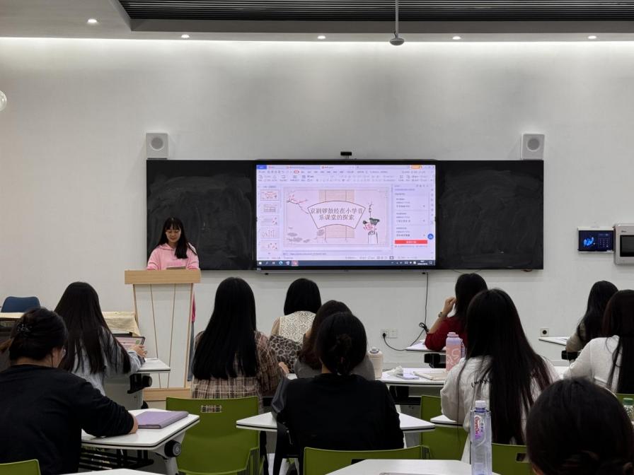 然后,由音乐教育方向的黄秋果同学以《京剧锣鼓经在小学音乐课堂的探索》为题,以京剧锣鼓经的律动和节奏特点为切入点进行汇报,通过念诵相对应的象声字模拟实际音响效果的同时做出模拟打击乐演奏的动作,让学生更直观感受与体验节拍的强弱规律和律动感,感受传统艺术的魅力,培养学生的爱国主义情感;