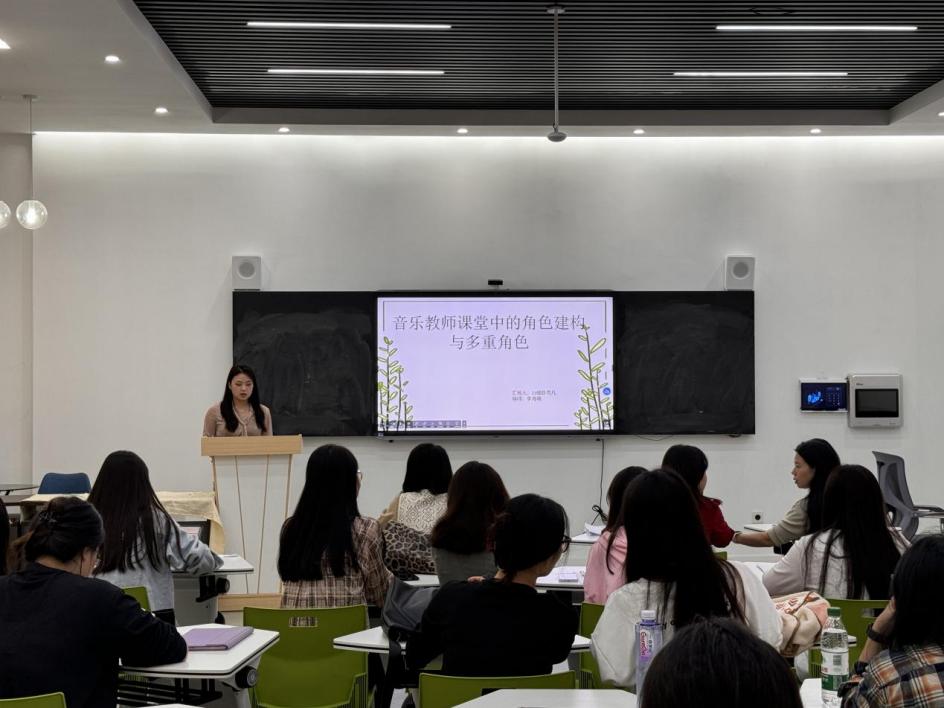 接着,由音乐教育方向的陈雨凡同学以《音乐教师课堂中的角色建构与多重角色》为题,运用“伪装者”“旁观者”“拾荒者”三种角色扮演的新颖角度进行汇报,通过分析角色的扮演和冲突以及其背后的理论逻辑,为音乐教师在课堂中提供角色定位帮助,更好地理解师生之间的相互作用;