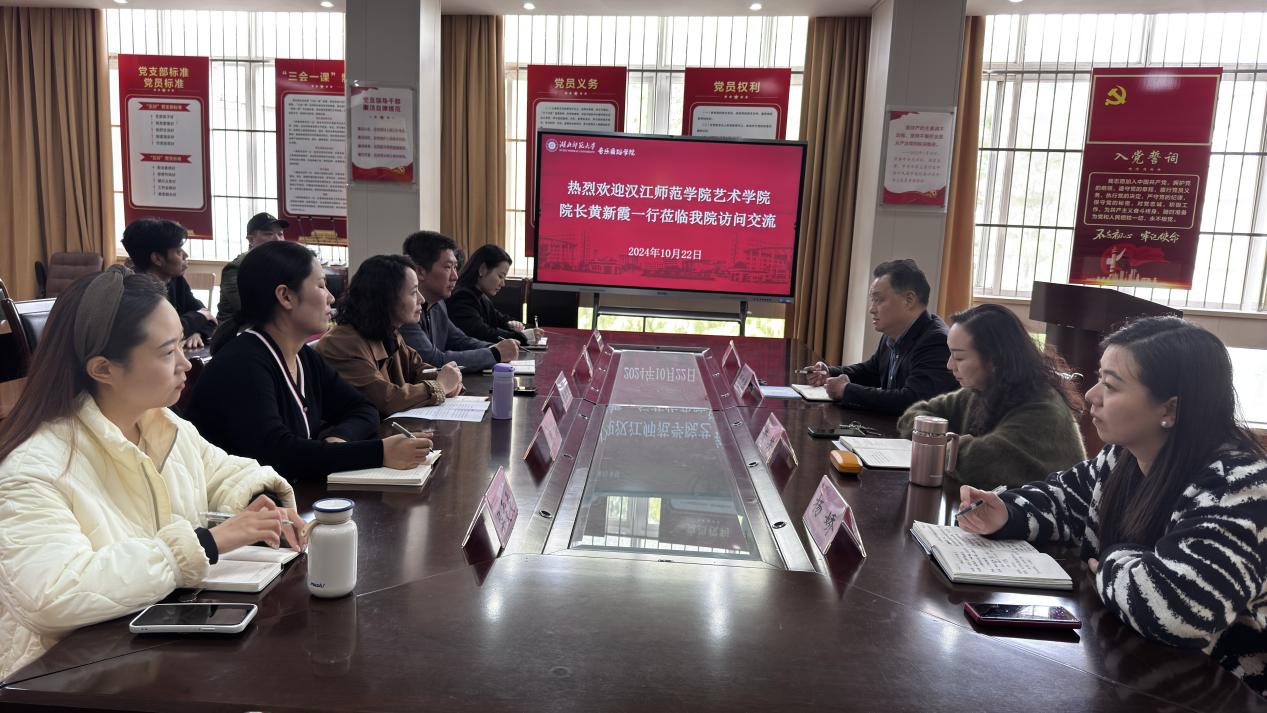 2024年10月22日,汉江师范学院艺术学院院长黄新霞、副院长向磊一行来院访问交流。学院院长周友良、党委副书记杨娇、副院长李海萌、黄芳出席座谈会,各系部主任参与交流。