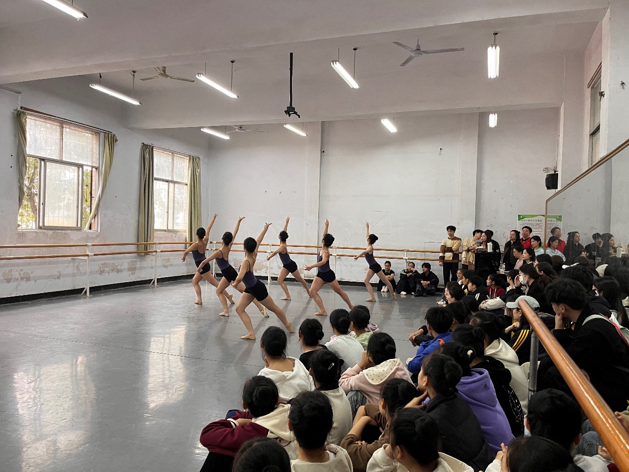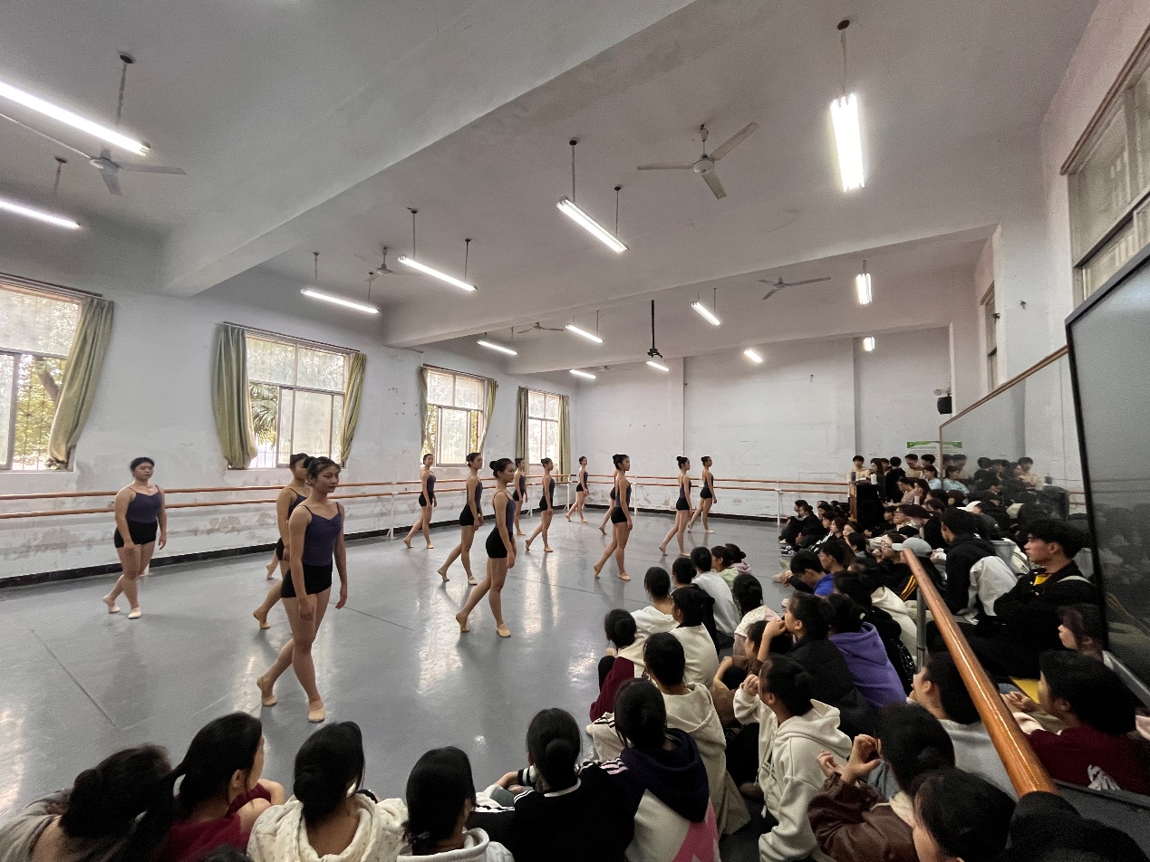 在指导教师的带领下,全体学生带着对舞蹈的热爱和渴望提升自我的热情,积极投入到此次见习中。第一个环节是看课,黄石艺校的老师们精心准备了课堂内容,从舞蹈基本功把上训练开始,每一位艺校学子的姿势都十分标准,无论是体态伸展还是脚步站位,都看出是经过了严格训练,课堂的老师也尽心尽力、耐心纠正学生体态。在随后的舞蹈片段教学环节,更是精彩纷呈,复杂的舞步和灵动的手势在老师的示范下,宛如行云流水,每一次旋转、每一次跳跃,都展现出他们对舞蹈的专注。全体见习生们目不转睛地学习老师的姿态以及教学方式发法,有效反思自身,受益颇多。