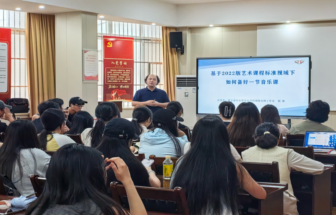 为响应教育部 “大中小一体化” 美育浸润行动计划,bevictor伟德国际1946于2025626日下午举办《如何备好一节音乐课》专题讲座。活动依托“乐仁计划・YR043”磁湖学术交流平台,由音乐教育系、湖北师大黄石民族管弦乐研究中心、湖北省非物质文化遗产研究中心(湖北师大)联合承办,邀请黄石市音乐学科胡俊名师工作室主持人、音乐高级教师胡俊担纲主讲。讲座伊始,由我院副院长黄芳教授致欢迎辞,现场有106位音乐教育专业的同学,以及芦乔曦副主任、刘群博士、王玉果博士等共同聆听了本次讲座。胡俊老师以“基础教育音乐教师培养项目”为载体,将其深耕义务教育阶段音乐教学二十多年的实践经验转化为可操作的备课范式,搭建起高师教育与基础教育的衔接桥梁。