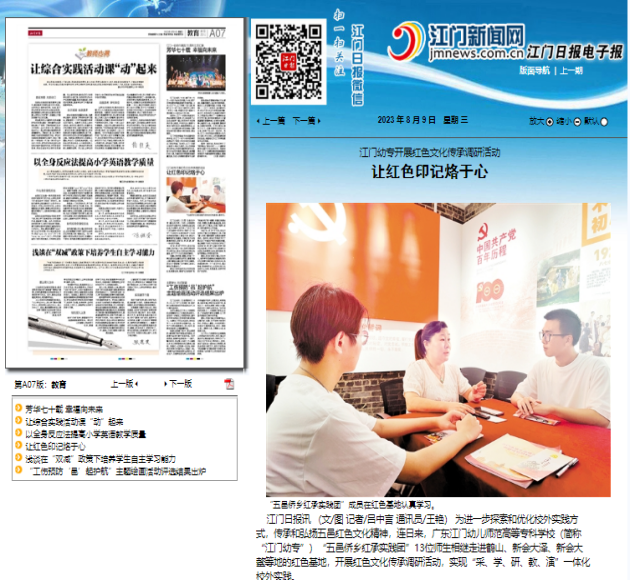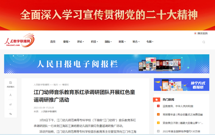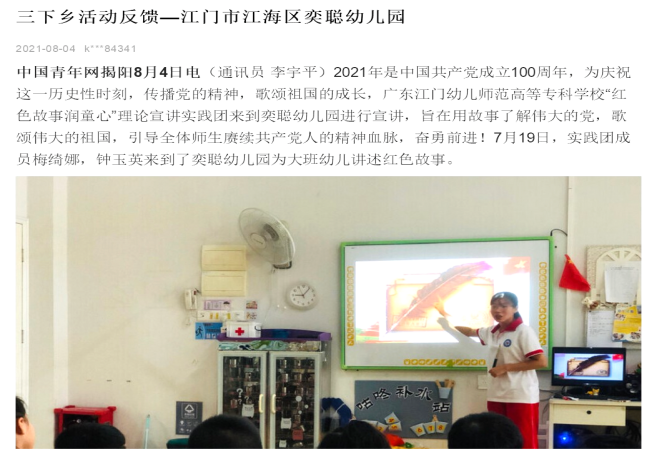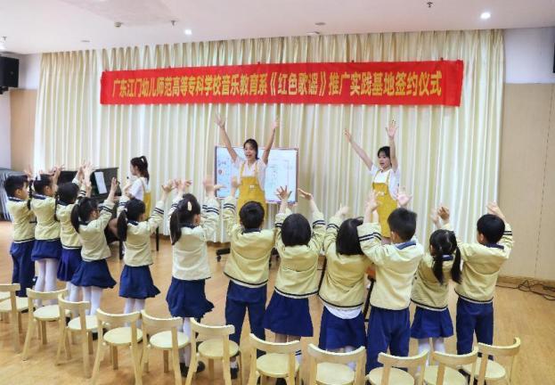 红承团队在学校系部支持下,分别在10所小学﹑幼儿园建立了《五邑红色歌谣》的推广实践基地,定期到实践基地为学生推送关于《五邑红色歌谣》的传唱课程。团队到了偏远的山区台山市深井镇中心小学实践基地,为二年级学生讲授了团队改编的五邑红色歌谣《党是太阳我是花》的音乐课,受到师生的一致好评,被台山电视台“台山融媒体中心”作为先进典型事例报道,也得到当地政府部门的一致认可。队员到江门市江海区江演明星幼儿园、江门市蓬江区嘉福幼儿园等幼儿园为幼儿开展五邑红色歌谣的音乐活动,推广五邑红色音乐,对幼儿进行爱国主义教育。