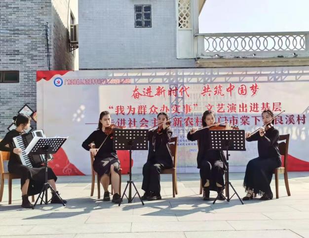 我们围绕立德树人根本任务,积极带领红承团队成员充分发挥专业特长,助力乡村振兴,提升社会服务能力。2022年1月,所有团队成员参加了“筑梦新时代,奋进新百年‘我为群众办实事’文艺演出进基层——走进社会主义新农村江门市棠下镇良溪村”活动,惠民演出取得圆满成功,受到人民群众的高度称赞。2023年7月14日,团队与鹤山市文化馆联合在鹤山下沉广场举办了“传承侨乡红色文化”演出活动。通过“我为群众办实事”等艺术社会实践活动,发挥学生专业特长,助力乡村振兴,丰富和深化大学生思想政治教育,在理论和实践相结合的过程中增长才干、提升能力,从而优质成才、全面成才。