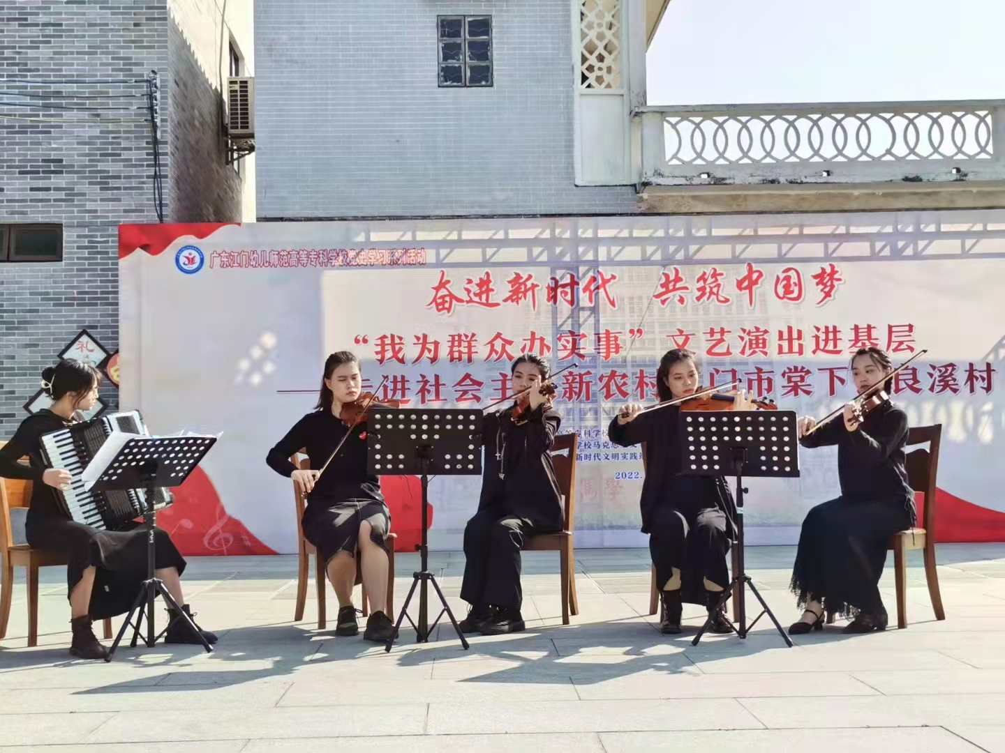音乐教育专业围绕立德树人根本任务,有效开展“三全育人”工作,增强新时代大学生的使命担当,提高服务社会的责任意识;充分发挥师生专业特长,助力乡村振兴,提升社会服务能力。2022年1月,音乐教育系开展“筑梦新时代 奋进新百年‘我为群众办实事’文艺演出进基层——走进社会主义新农村江门市棠下镇良溪村”活动。30多名师生参加惠民演出取得圆满成功,受到人民群众的高度称赞。2023年7月14日,我系师生团队与鹤山市文化馆联合在鹤山下沉广场举办了“”演出活动。 通过“我为群众办实事”等艺术社会实践活动,在实践中,发挥学生专业特长,助力乡村振兴,丰富和深化大学生思想政治教育,在理论和实践相结合的过程中增长才干、提升能力,从而优质成才、全面成才。