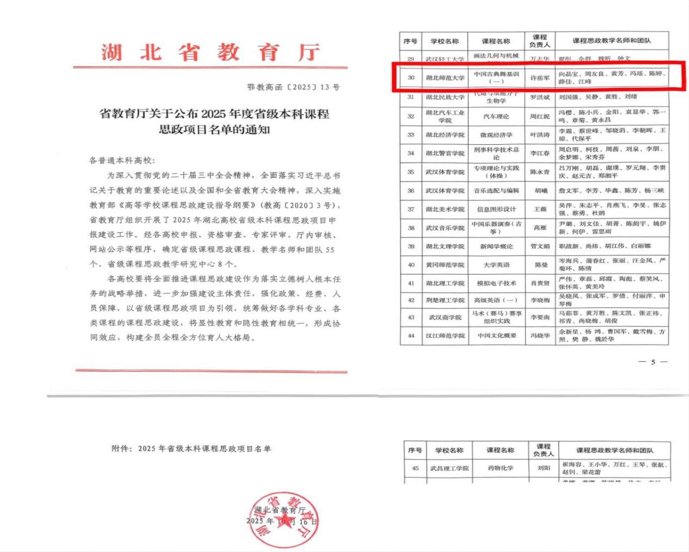 近日,湖北省教育厅公布2025年湖北省高校本科课程思政项目名单,我院舞蹈系许岳军副教授带领的《中国古典舞基训》课程教学团队成功获批“湖北省课程思政教学团队”,标志着我院在舞蹈专业课程思政建设领域取得重大突破,为同类课程育人实践提供了可借鉴的示范样本。以此同时,这一殊荣不仅是对该课程教学改革与育人成效的充分肯定,更是对我院长期坚持“立德树人”根本任务、深化教育教学改革、推进课程思政建设的生动诠释。