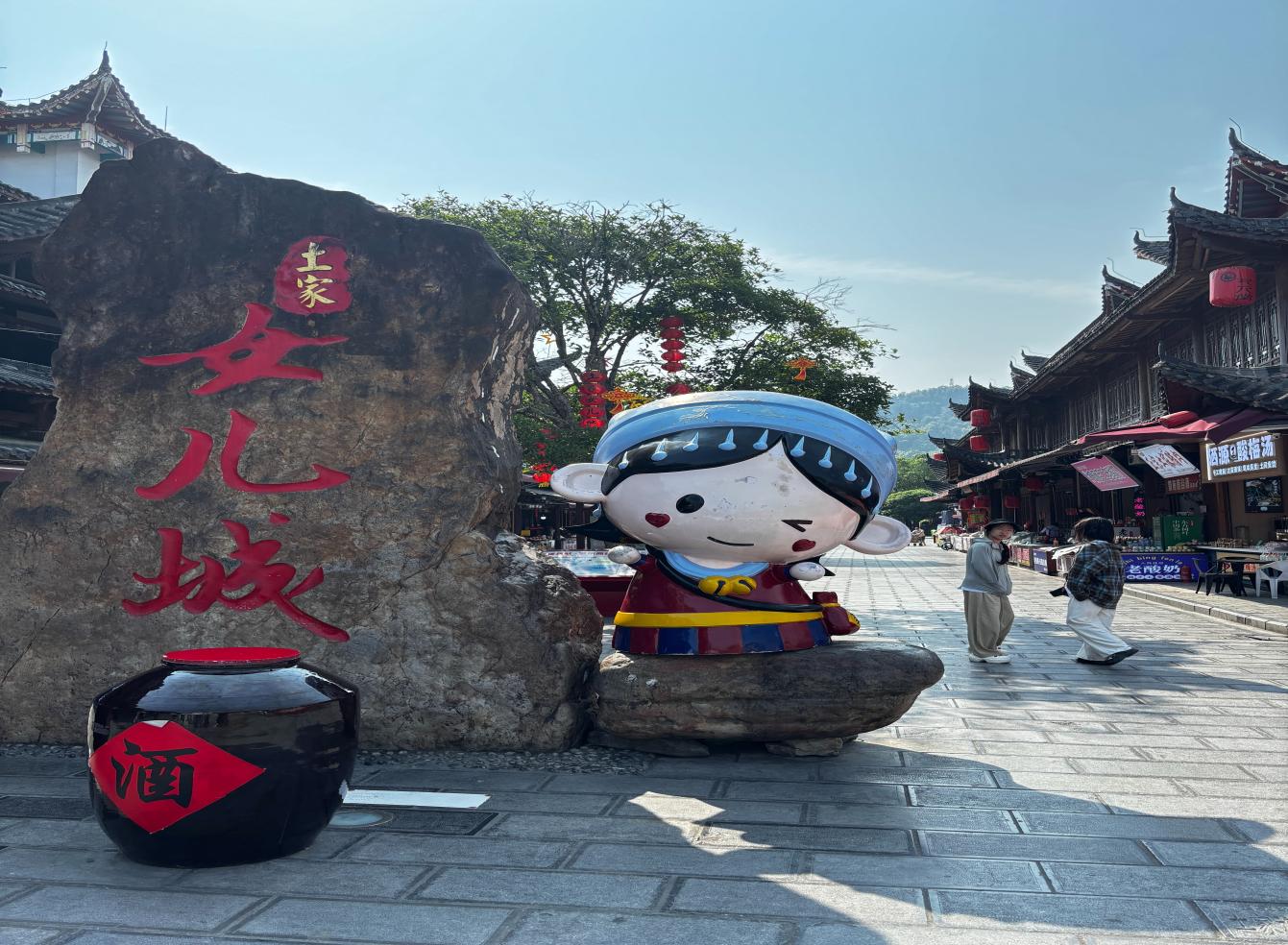 走近女儿城,映入眼帘的是壮观的大水车,它悠悠转动,仿佛在诉说着古老的故事。踏入恩施女儿城的瞬间,青石板路蜿蜒向前,雕花木窗透着柔光,飞檐翘角在蓝天下勾勒出灵动的弧线。这里不只是一座城,更是土家族千年风情的鲜活画卷,每一步,都踩着时光的韵律。沿着石板路前行,街道两旁古色古香的建筑飞檐翘角,洋溢着浓郁的土家韵味。红色的灯笼与许愿牌交相辉映,为古城增添了几分喜庆与神秘。