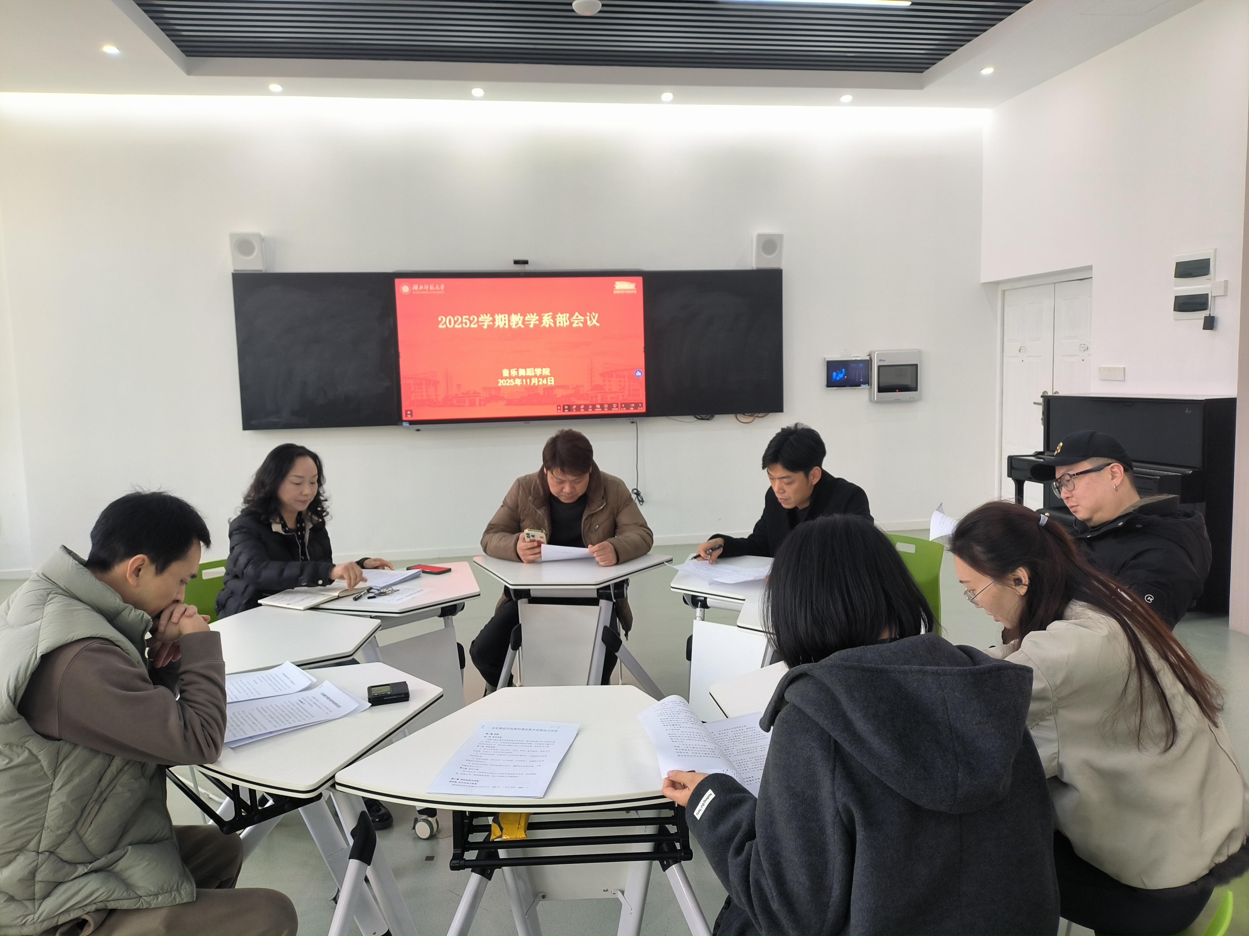 20251124,bevictor伟德国际1946在13310召开了系部工作会议。会议由黄芳副院长主持,教学办闫明星主任、各系部主任参加了此次会议。会议围绕期中教学检查反馈整改、部分教学制度修订、专业选修课开课人数确定、AI课程建设以及音乐学与舞蹈学师范专业认证持续改进等核心议题进行了深入研讨和部署。