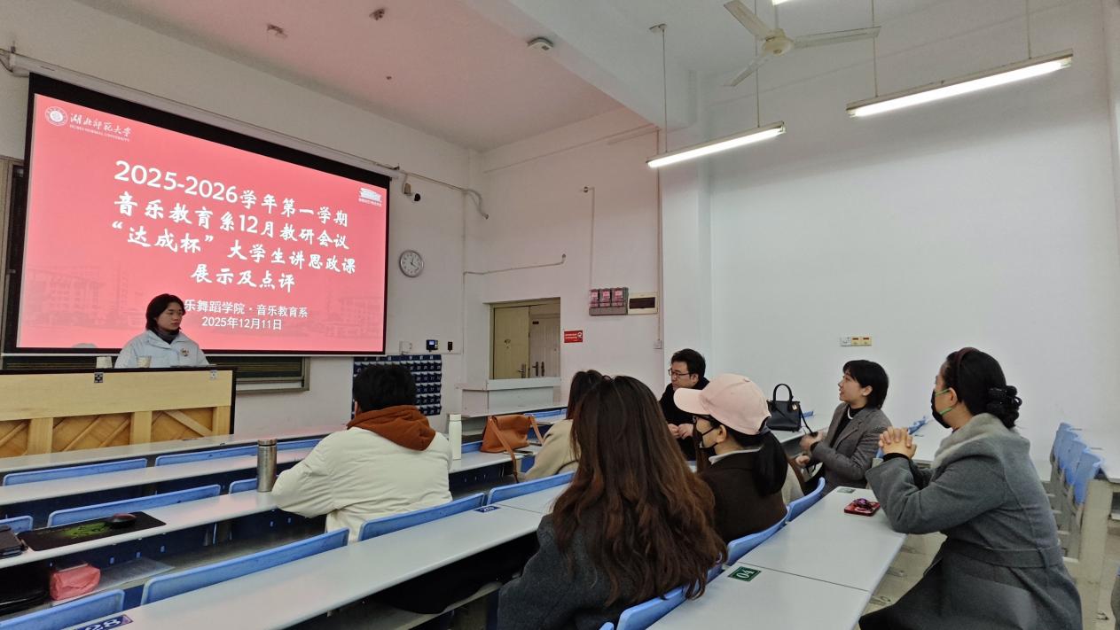 2025年12月11日下午,音乐教育系在13306教室举行12月份教研活动。全系教师齐聚一堂,聆听音乐学专业学生“达成杯”大学生讲思政课展示,并围绕“音乐+思政”教学融合创新展开深入研讨。