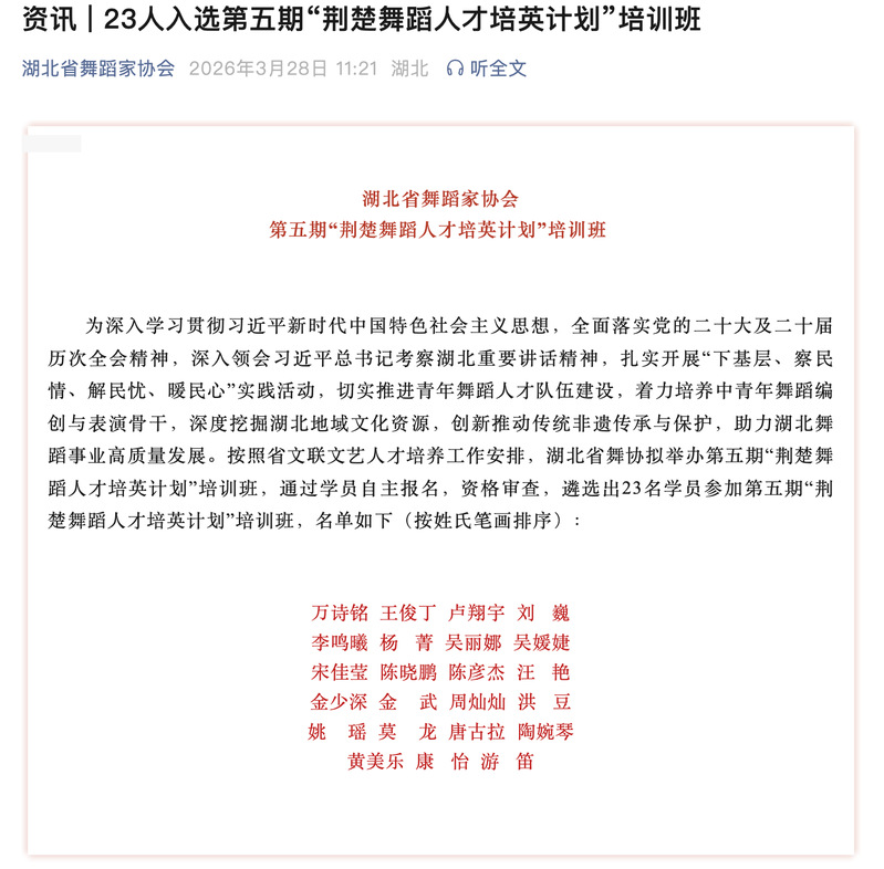 3月28日,湖北省舞蹈家协会正式发布第五期“荆楚舞蹈人才培英计划”培训班入选名单,我院青年舞蹈教师金武博士成功入选该计划,成为全省23名入选学员之一。